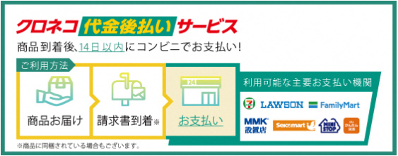 クロネコ代金後払いは、商品の到着後に別途郵送するコンビニ払込用紙でお支払いいただけるサービスで、手数料250円(税込)でご利用いただけます。